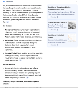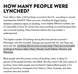 Lastly, I noted that the NAACP website isn’t a good source about the US history of lynching. It claims there were no recorded lynchings in Idaho, when obviously there was, but the whole article is really about Black people and lynchings involving Black people.