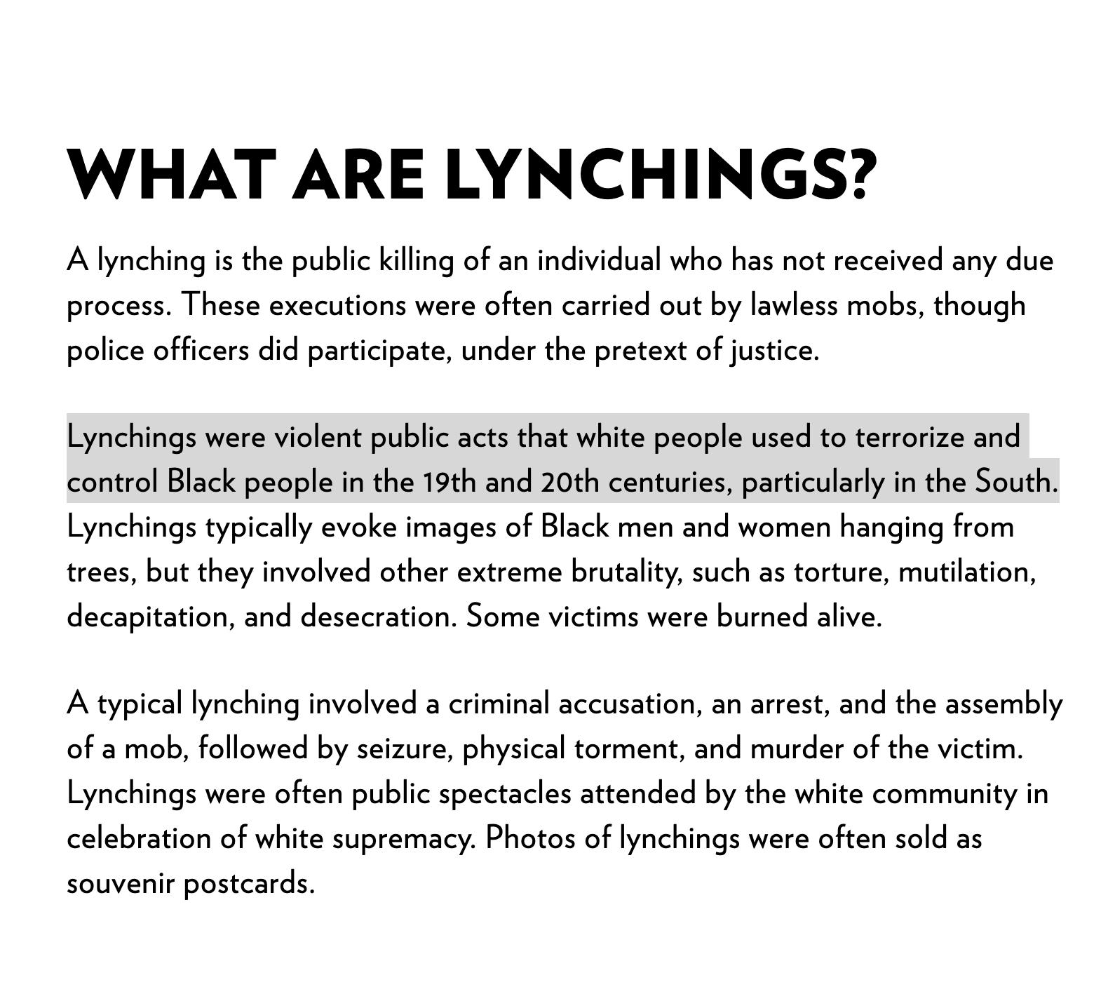 The NAACP gives a narrow definition of lynchings. “Lynchings were violent public acts that white people used to terrorize and control Black people in the 19th and 20th centuries, particularly in the South.” This is only about Black people.