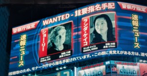 In Shibuya, Tokyo, surveillance cameras pick up Keiko, Old Lee and Kentaro crossing a major intersection amongst a crowd. A news flash posted their photos on an electronic billboard.